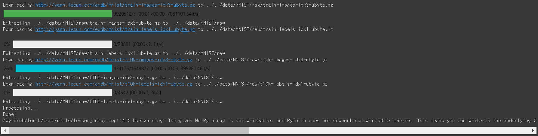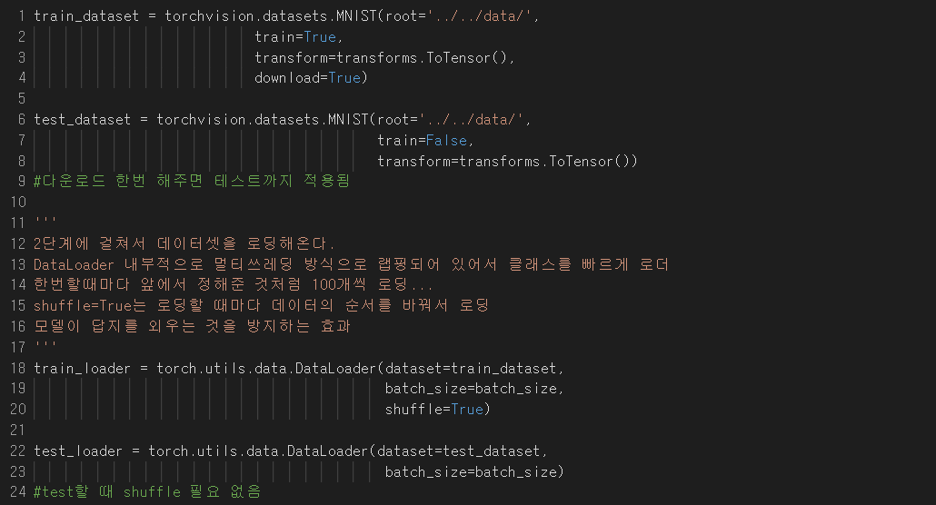 - Test DataSet과 Training DataSet을 분리해서 따로 저장. train을 기준으로 True면 트레이닝 데이터, False면 테스트 데이터.