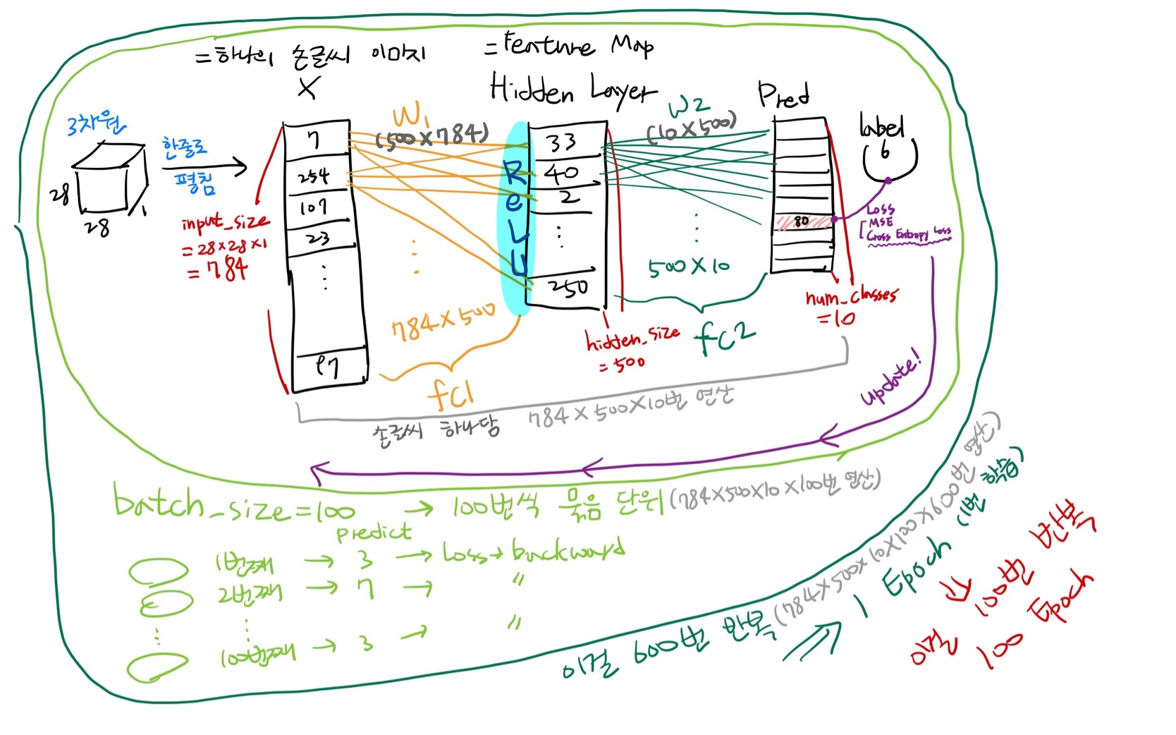 학습을 하는 게 batch size 단위로 하게 됨. batch size별로 부분적으로 학습을 하고 전체적인 학습 1번이 1 Epoch이 됨.