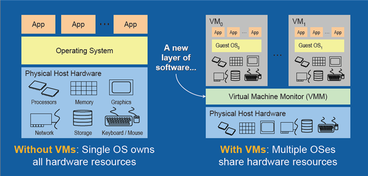 - 클라우드 서비스를 가능하게 하는 핵심 기술. 물리적 컴퓨터 환경상에 가상 인스턴스(또는 가상 머신)를 만드는 데 사용