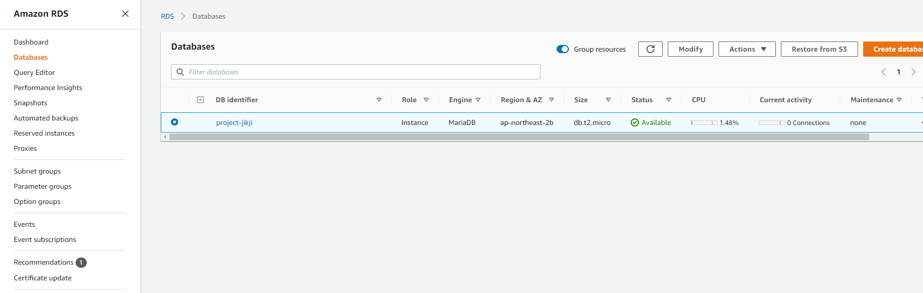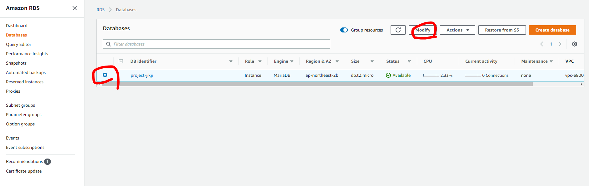 좌측 메뉴 Databases 선택하고 데이터베이스를 선택해서 Modify를 클릭한다.