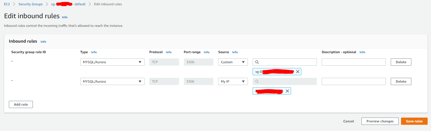 - 복사한 EC2에 사용된 Security group ID와 내 IP를 RDS Security Group의 Inbound Rules에서 Edit inbound rules로 변경