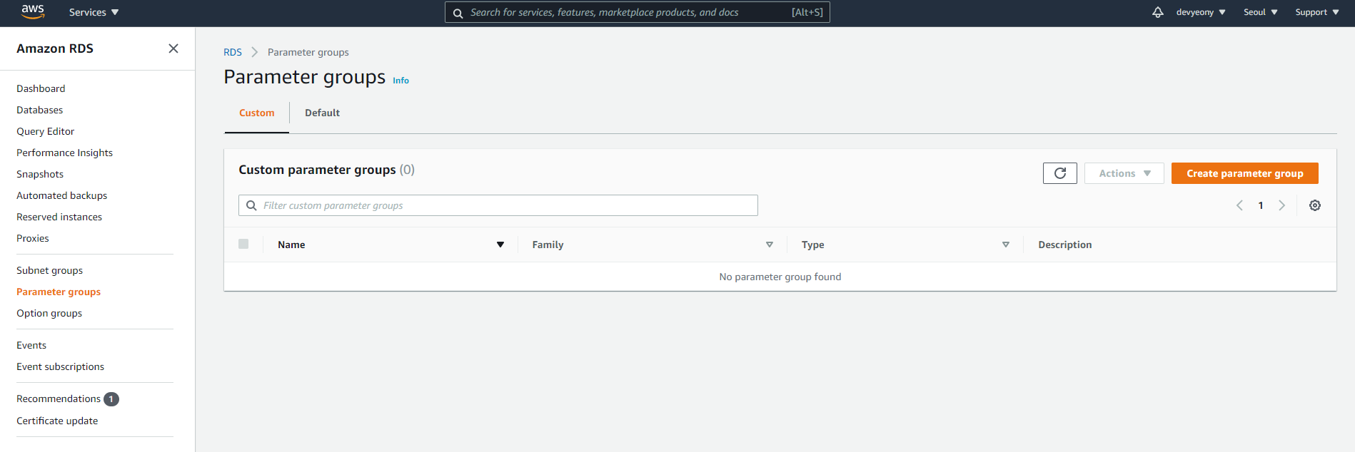 좌측 메뉴 Parameter groups 클릭 - Create parameter group 클릭