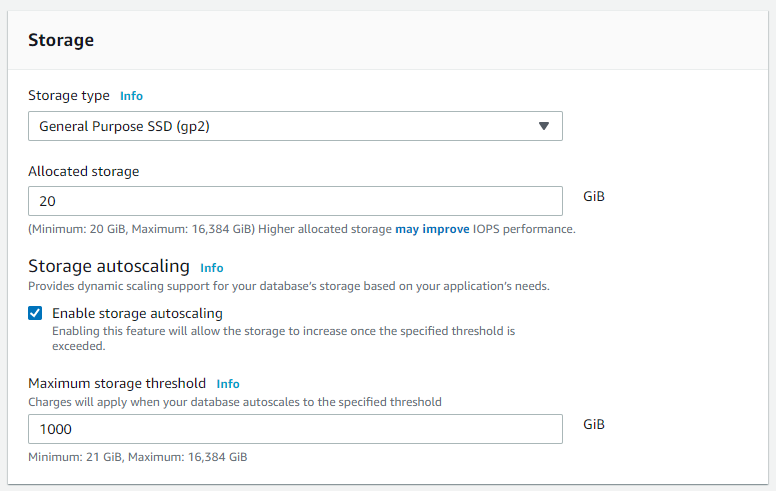 스토리지 설정은 일단 기본 세팅(스토리지 유형 : 범용(SSD) / 할당된 스토리지 : 20GiB / 스토리지 자동 조정 활성화)으로 가겠다