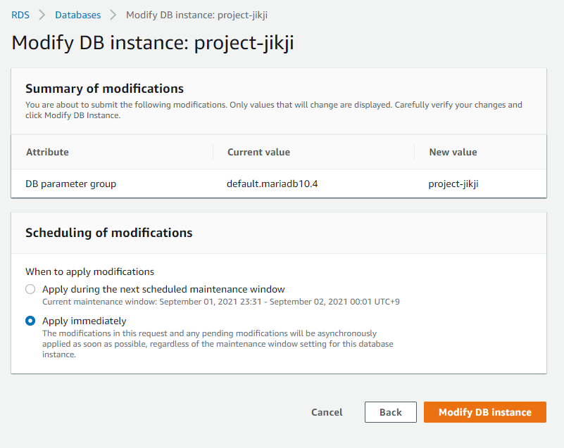 수정 사항 적용 시점을 선택할 수 있는데 예정된 다음 유지 관리 기간에 적용하지 않고 즉시 적용을 선택하고 Modify DB instance를 클릭한다.