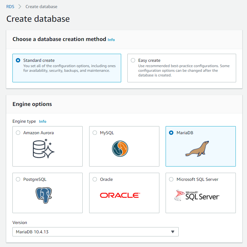 세부 정보 위쪽에 DB 엔진을 선택하는 항목이 있는데, 위에서 생성한 MariaDB와 같은 버전으로 맞추고 Parameter group 이름과 설명을 적고 Create 선택