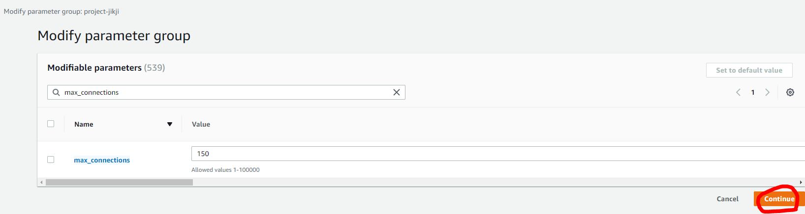 Additional configuration의 DB parameter group에서 위에서 생성된 파라미터 그룹으로 변경하고 아래 Continue 버튼을 클릭한다.