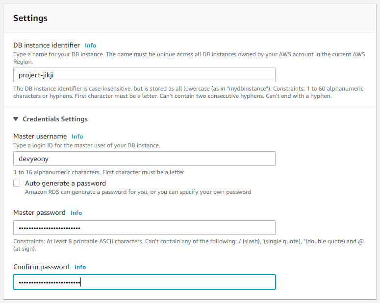 DB 인스턴스 이름을 입력하고 마스터 사용자 이름과 비밀번호를 입력한다.