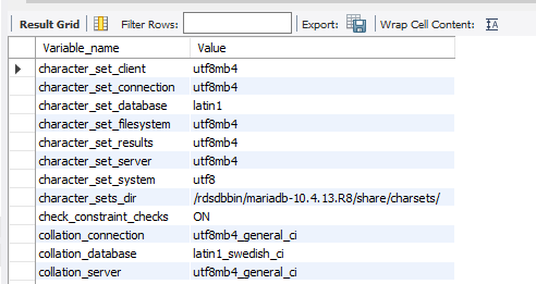 다른 필드들은 utf8mb4가 잘 적용되었는데 character_set_database, collation_database는 latin1로 되어 있다.